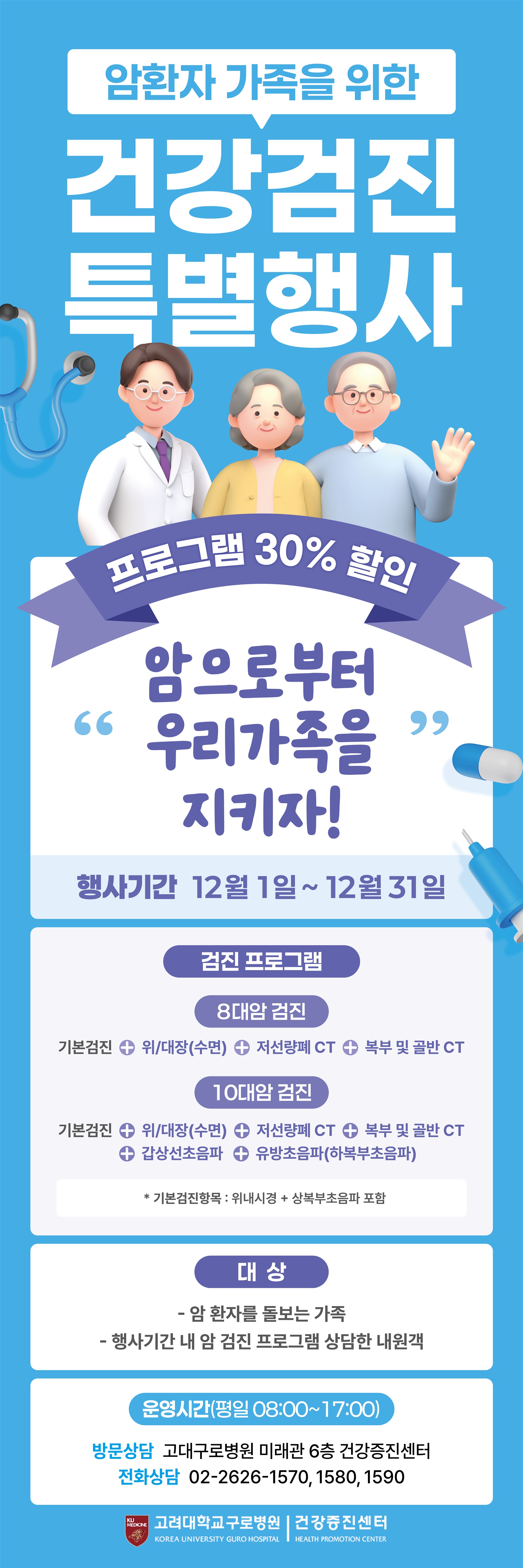 상담예약은 고객의 편의를 위하여 전문 상담원이 전화를 통해 검진예약을 도와 드리는 서비스입니다.